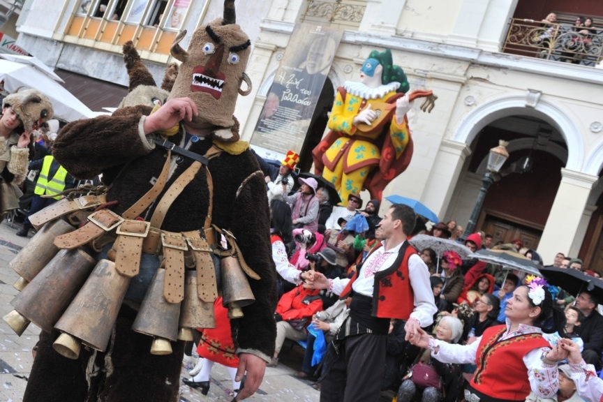 The group of masquerades, accompanied by the musicians, visits all the houses of the village. Kalogeros rings his bell at every house, symbolizing fertility, wishes good year and forms a cross in the yard with a sponge. The housewife throws on him a mixture of cereals and legumes that are produced at the region. Laughter, voices, jokes and improvised teasing words characterize the first phase.